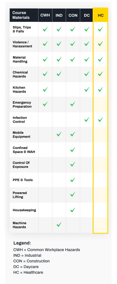 Our JHSC Part 2 Healthcare Course includes the below modules and meets the legal requirements of OHSA Section 9 (12), 7(6), Regulation 297/13 Section 5(1)., and the requirements of the Healthcare and Residential Facilities Regulation O.Reg. 67/93